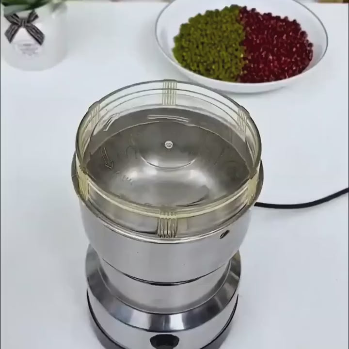 This versatile electric grinder is perfect for grinding coffee beans, spices, and grains. Made from durable stainless steel, it features a transparent cover for easy monitoring and cleaning.